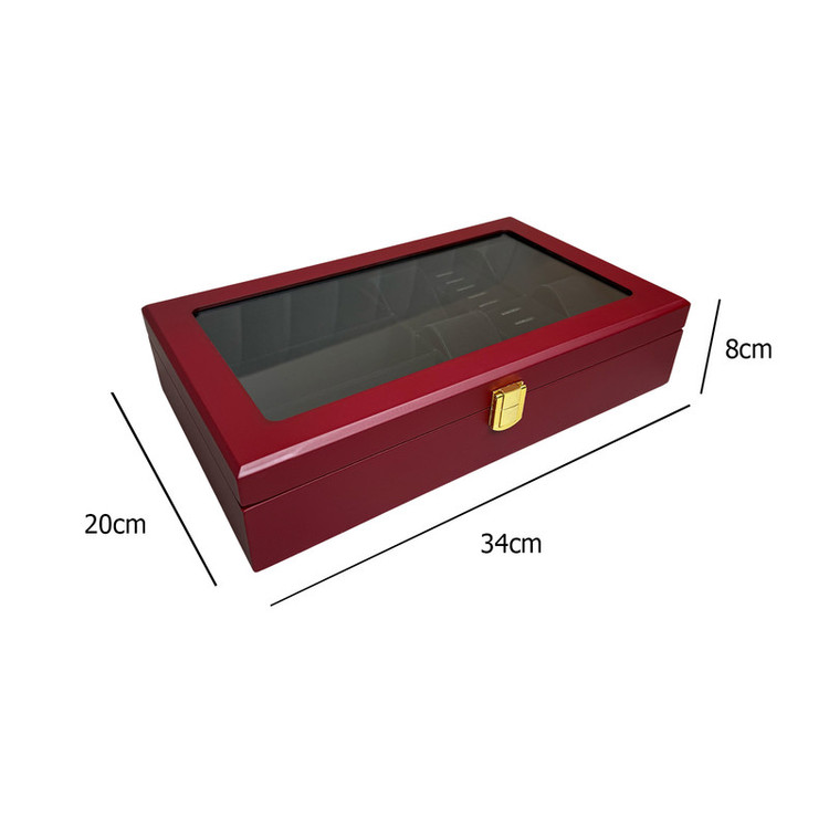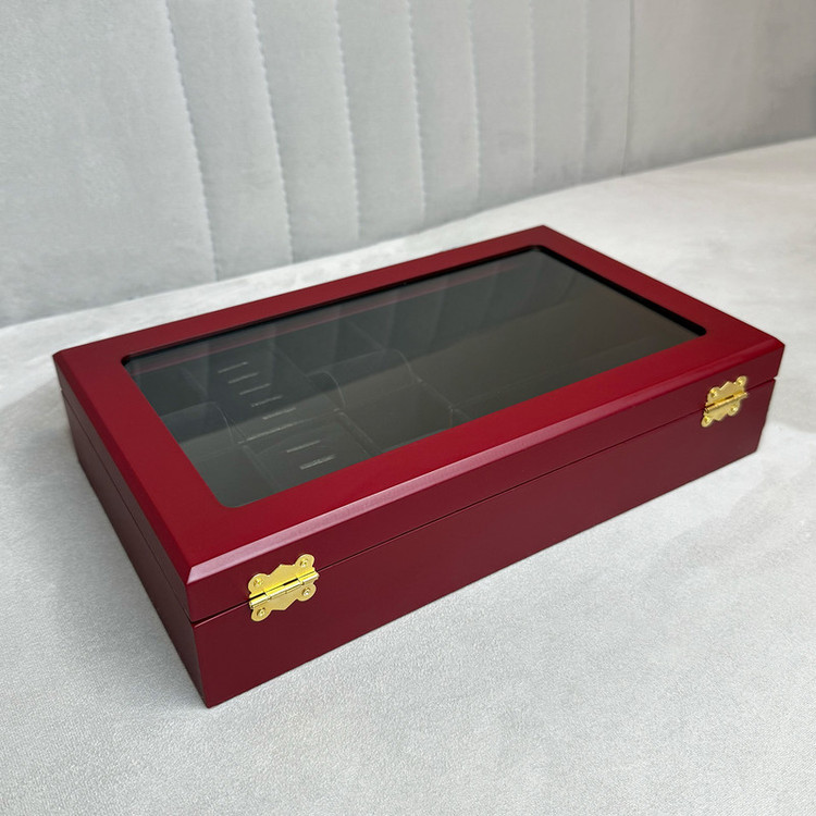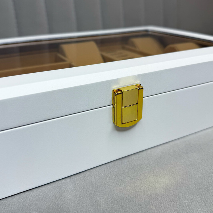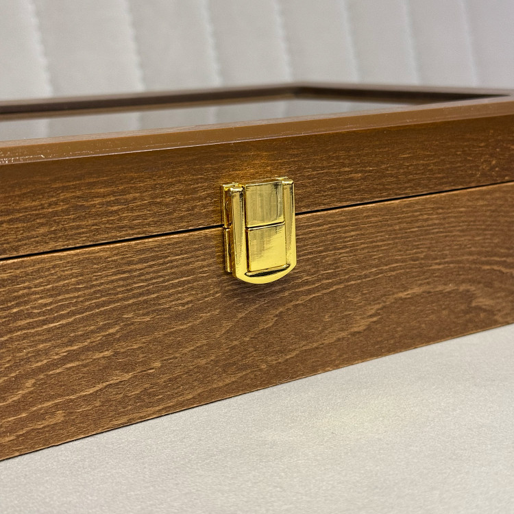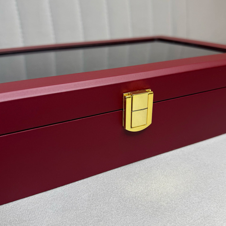بدنه جعبه از چوب مقاوم ساخته شده و با روکش باکیفیت در رنگهای زرشکی با مخمل مشکی و سفید با مخمل کرم و چوب با مخمل کرم عرضه میشود. درب شیشهای آن علاوه بر زیبایی، امکان مشاهده محتویات داخلی را فراهم میکند.