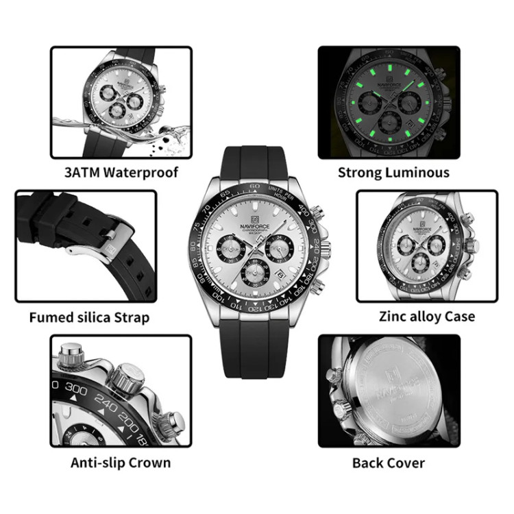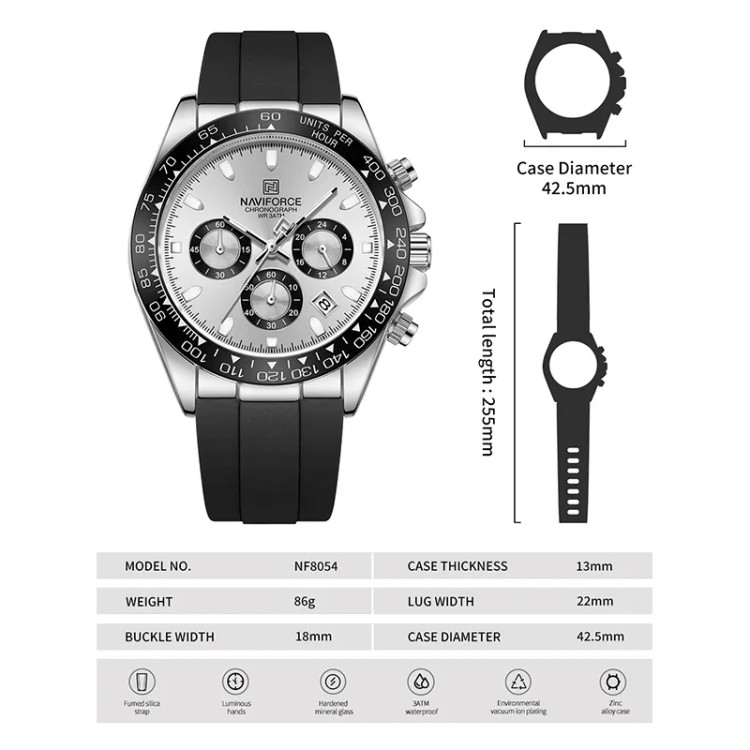 اگر به دنبال یک ساعت مچی مردانه اورجینال با طراحی اسپرت مسابقهای، موتور کرونوگراف کوارتز، شیشه معدنی مقاوم و بند سیلیکونی شیک هستید، مدل NF8054 انتخابی فوقالعاده است. این ساعت با ترکیب بینظیر استایل و عملکرد، رنگبندی جذاب،