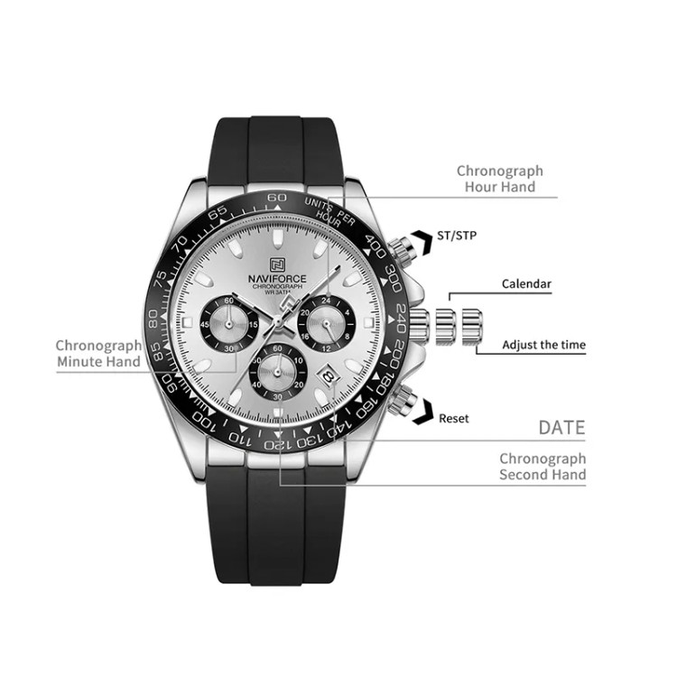 ساعت مچی مردانه Naviforce NF8054 یکی از مدلهای اسپرت، لوکس و پرفروش این برند محبوب است که با طراحی دقیق و توجه به جزئیات، به عنوان یک ساعت تحولآفرین در صنعت شناخته میشود. این ساعت با حاشیه (بزل) الهامگرفته از مسابقات اتومبیلرانی، ظاهری پویا و متمایز ارائه میدهد و صفحه فلزی جذاب همراه بند سیلیکونی دودی (fumed silica)، ترکیبی از استایل اسپرت و جواهرگونه را به نمایش میگذارد. شیشه معدنی مقاوم در برابر خش، عقربههای شبتاب برای خوانایی عالی در نور کم و مقاومت ۳ATM در برابر آب، آن را برای ماجراجوییهای ورزشی و استفاده روزمره ایدهآل میکند.