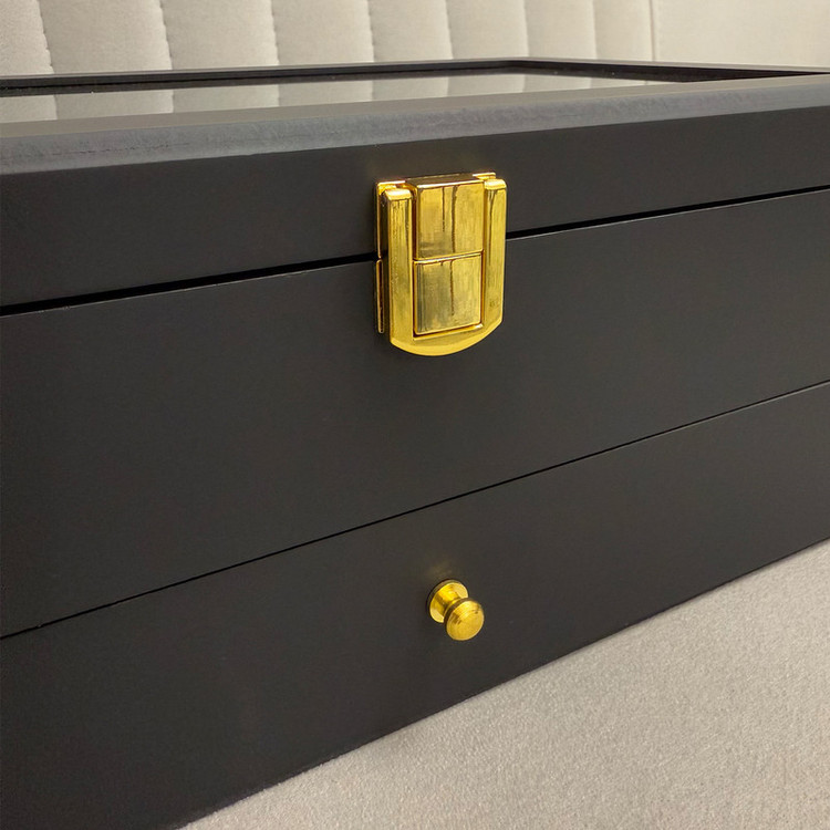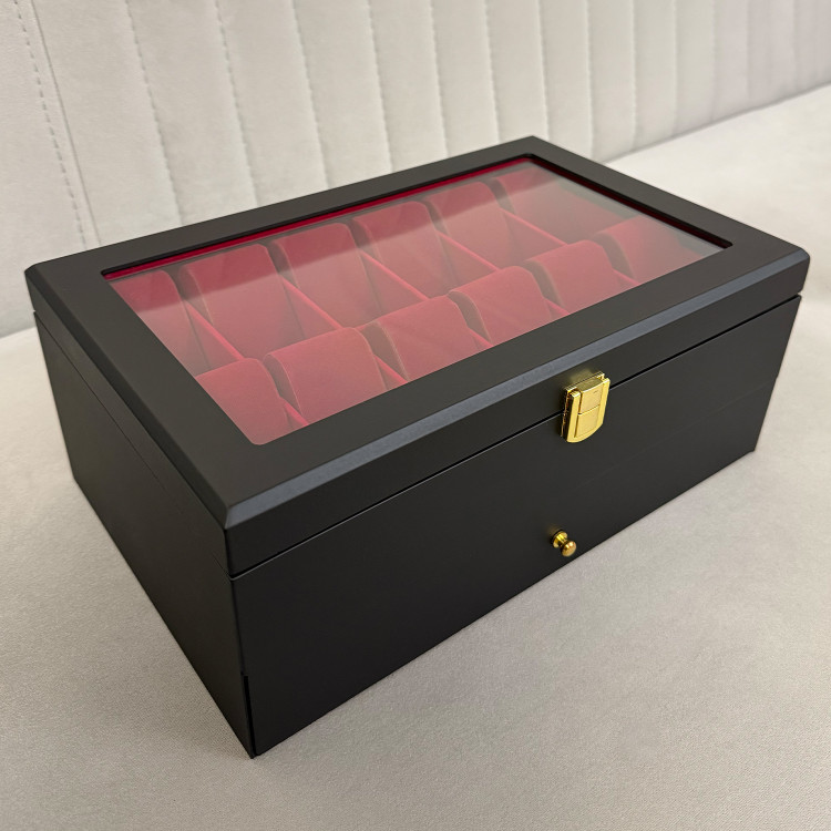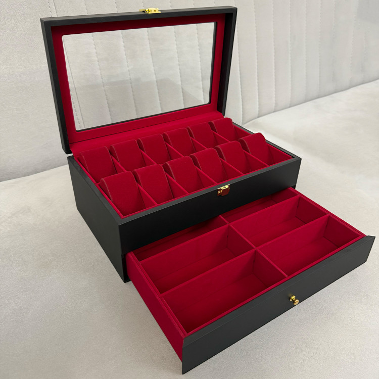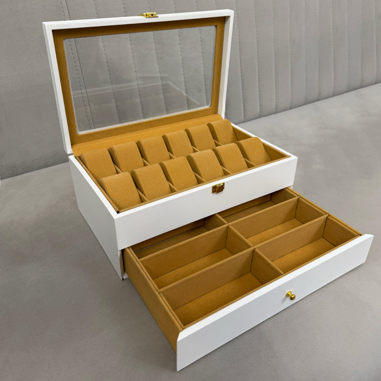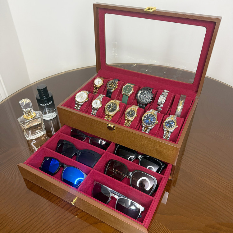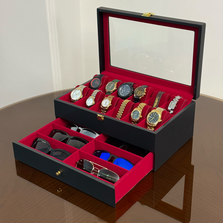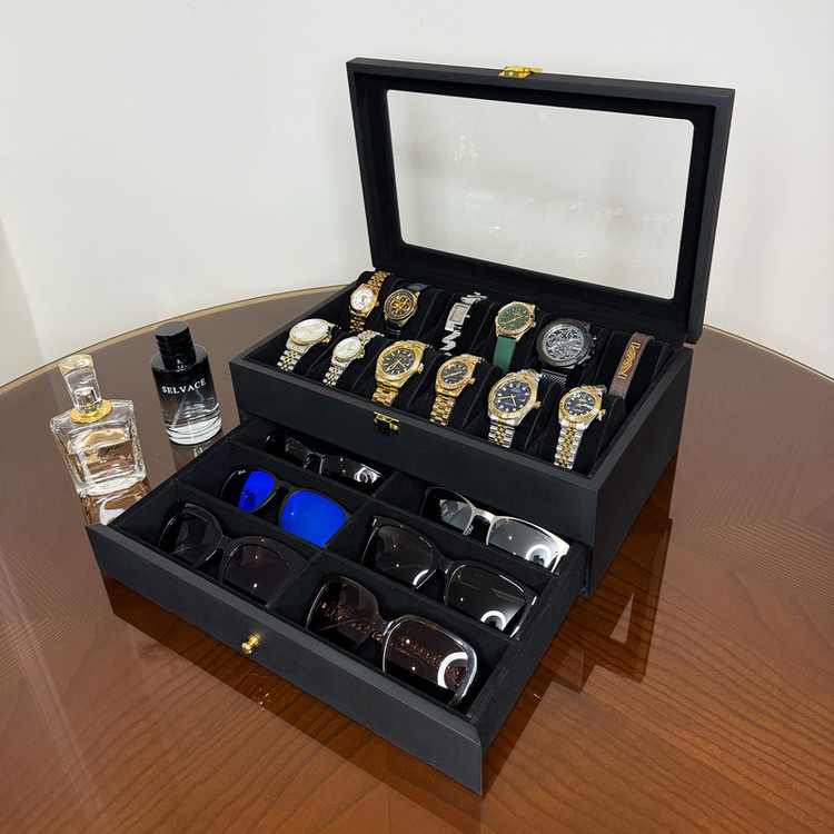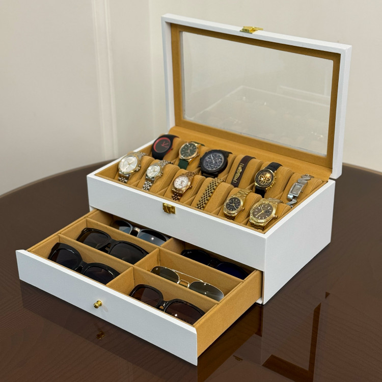 در قسمت بالای جعبه، ۱۲ خانه مخصوص ساعت قرار دارد که زیر یک درب شیشهای شفاف محافظت میشوند؛ مناسب برای نمایش و نگهداری امن ساعتهای ارزشمند شما. در قسمت پایین نیز یک کشوی مخفی وجود دارد که فضای نگهداری ۶ عینک آفتابی یا طبی را در اختیار شما قرار میدهد.