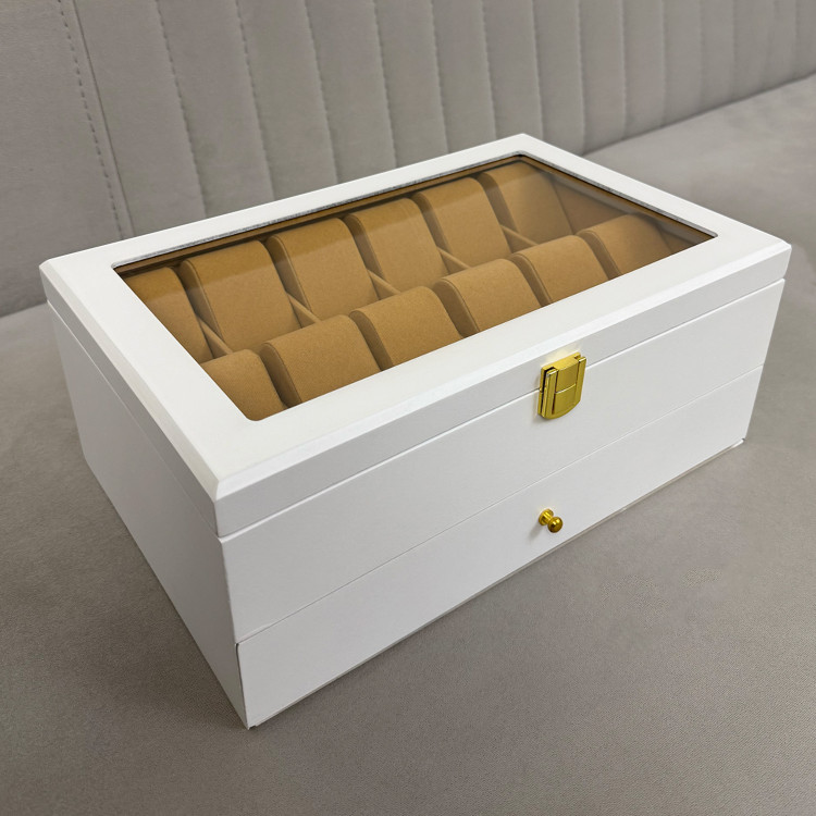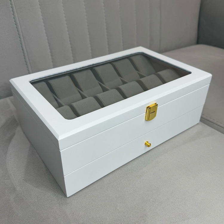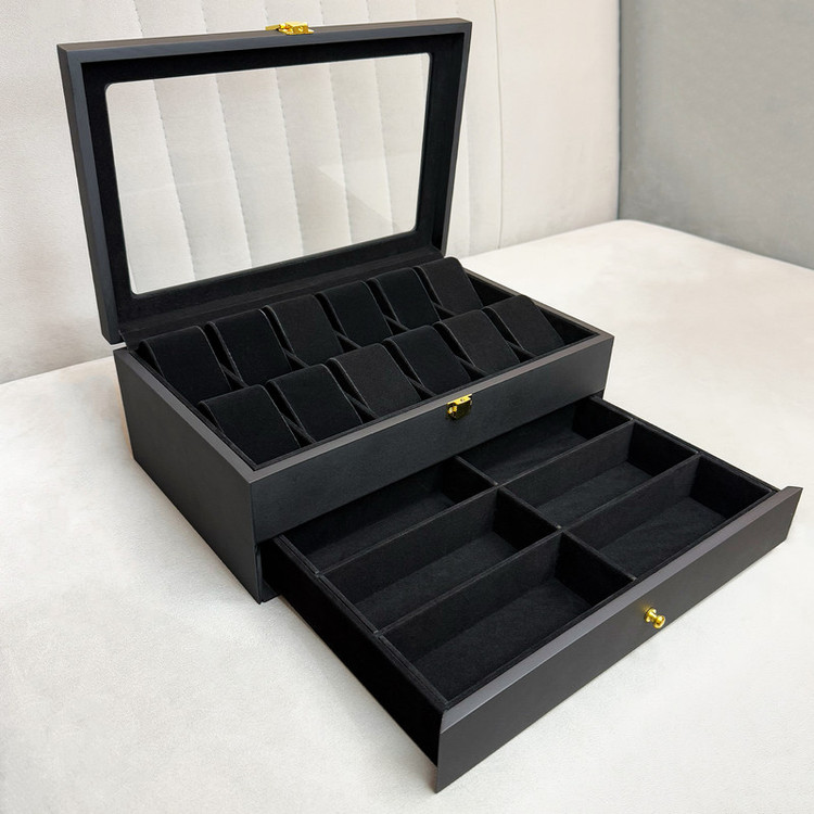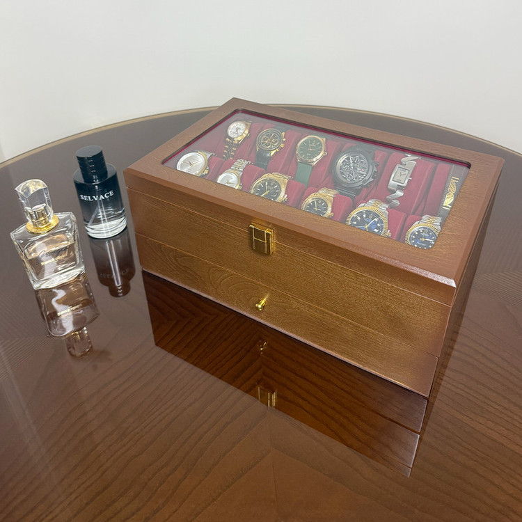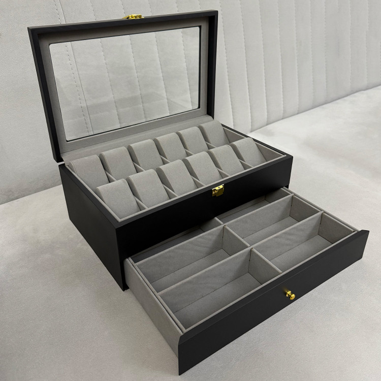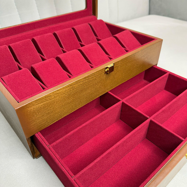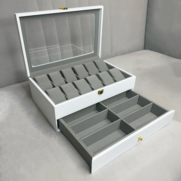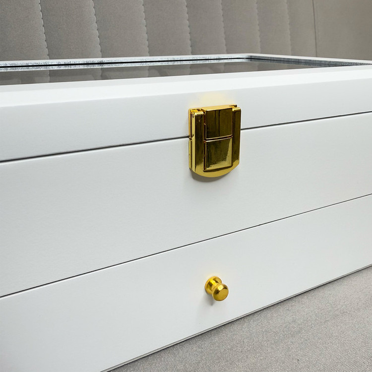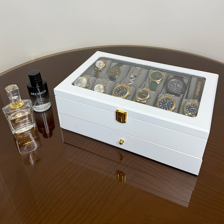 در قسمت بالای جعبه، ۱۲ خانه مخصوص ساعت قرار دارد که زیر یک درب شیشهای شفاف محافظت میشوند؛ مناسب برای نمایش و نگهداری امن ساعتهای ارزشمند شما. در قسمت پایین نیز یک کشوی مخفی وجود دارد که فضای نگهداری ۶ عینک آفتابی یا طبی را در اختیار شما قرار میدهد.