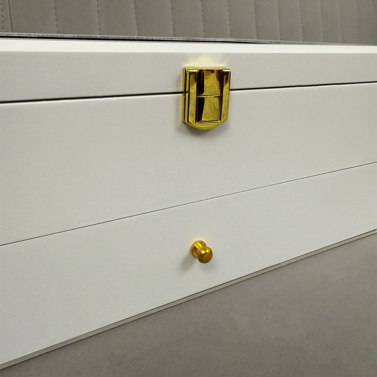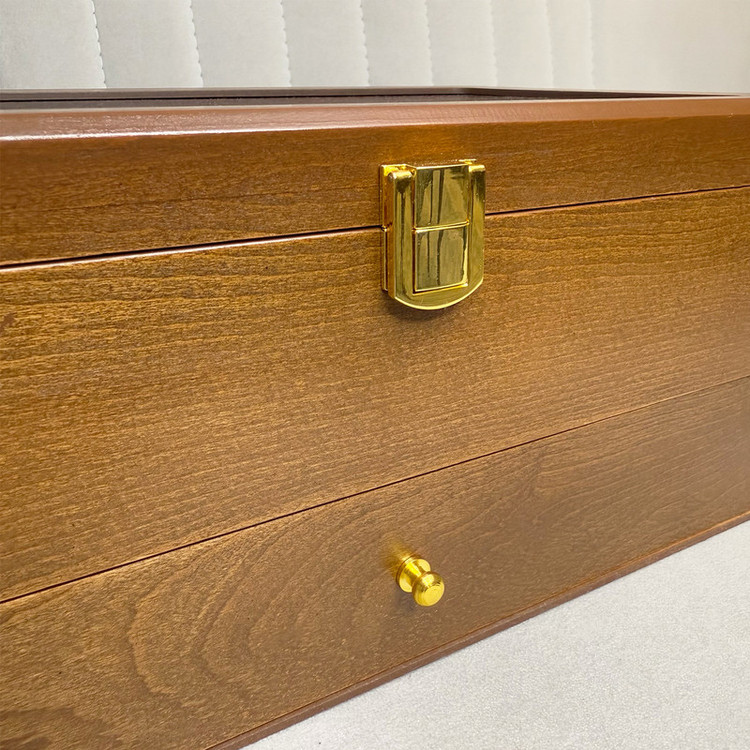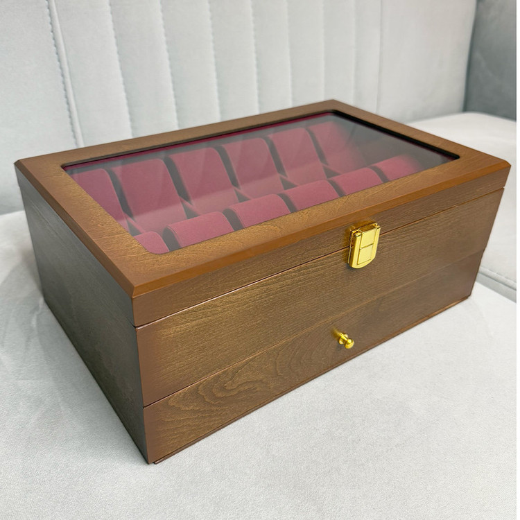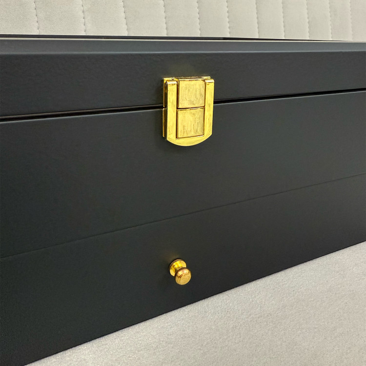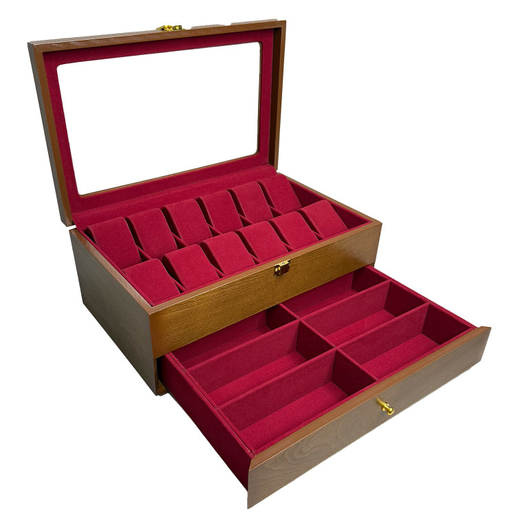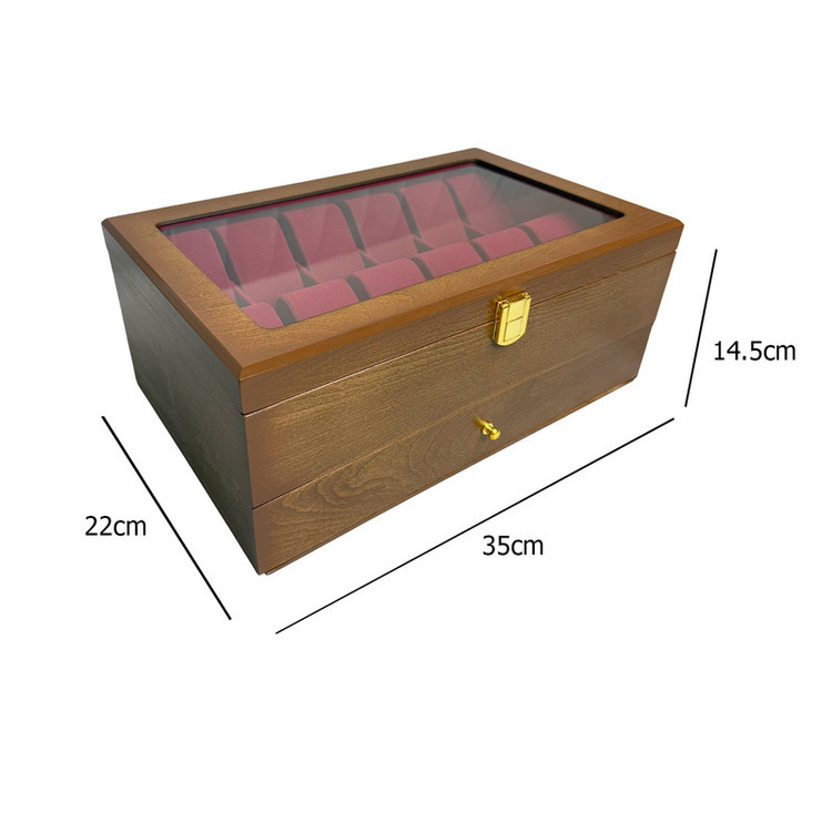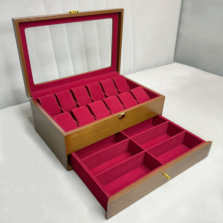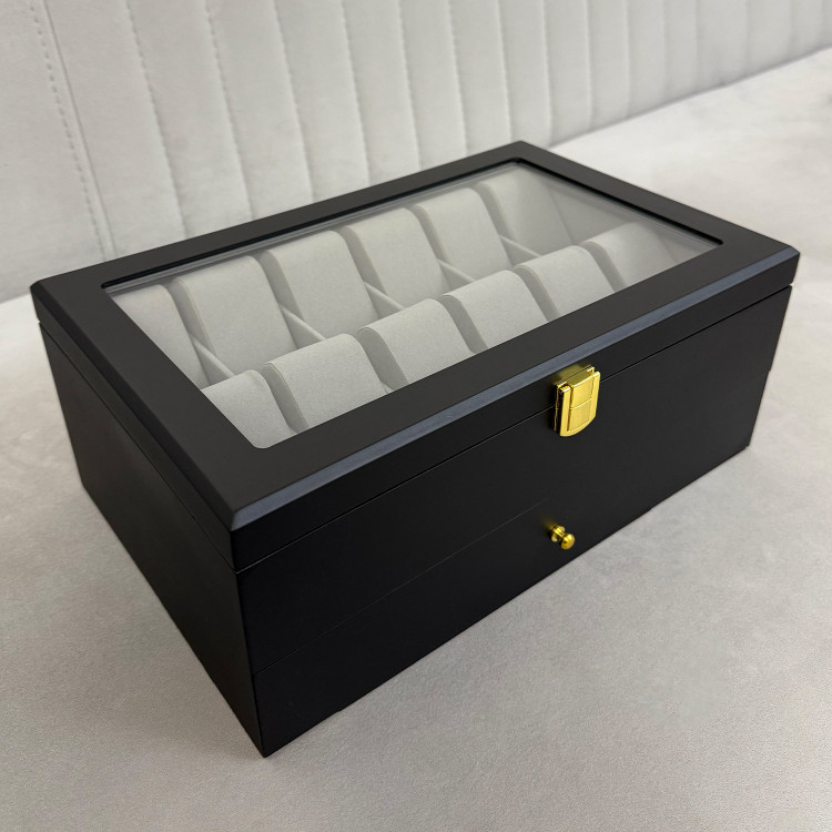 در قسمت بالای جعبه، ۱۲ خانه مخصوص ساعت قرار دارد که زیر یک درب شیشهای شفاف محافظت میشوند؛ مناسب برای نمایش و نگهداری امن ساعتهای ارزشمند شما. در قسمت پایین نیز یک کشوی مخفی وجود دارد که فضای نگهداری ۶ عینک آفتابی یا طبی را در اختیار شما قرار میدهد.