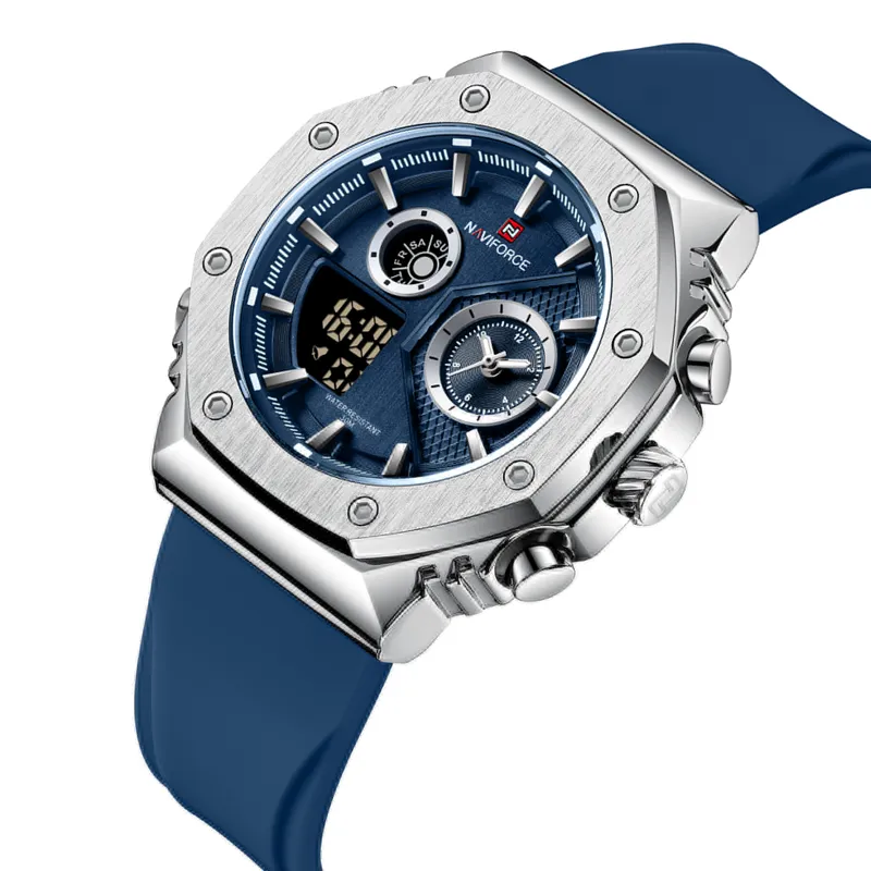 ساعت مچی مردانه NAVIFORCE NF9216 یکی از مدلهای اسپرت و پرطرفدار برند نیوی فورس است که با طراحی خاص، رنگبندی جذاب و امکانات کاربردی، انتخابی ایدهآل برای استفاده روزمره آقایان و بانوان محسوب میشود. این مدل به موتور دو زمانه دیجیتال–عقربهای مجهز بوده و با بهرهگیری از موتور کوارتز ژاپنی، دقت و دوام بالایی را ارائه میدهد.