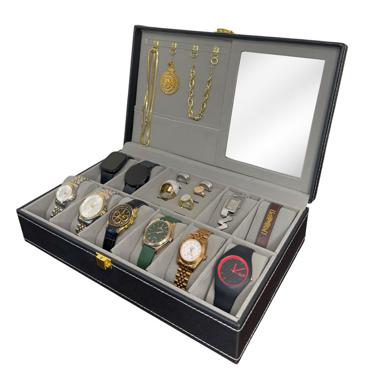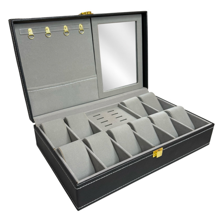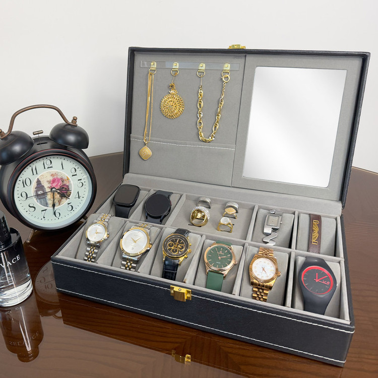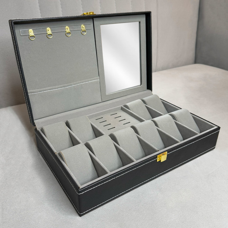 جعبه درب شیشه ای: قسمت داخلی جعبه دارای ۱۰ محفظه مخصوص ساعت و ۸ جای انگشتر میباشد که با مخمل ظریف و نرم پوشانده شده تا از جواهرات شما بهخوبی محافظت کند.