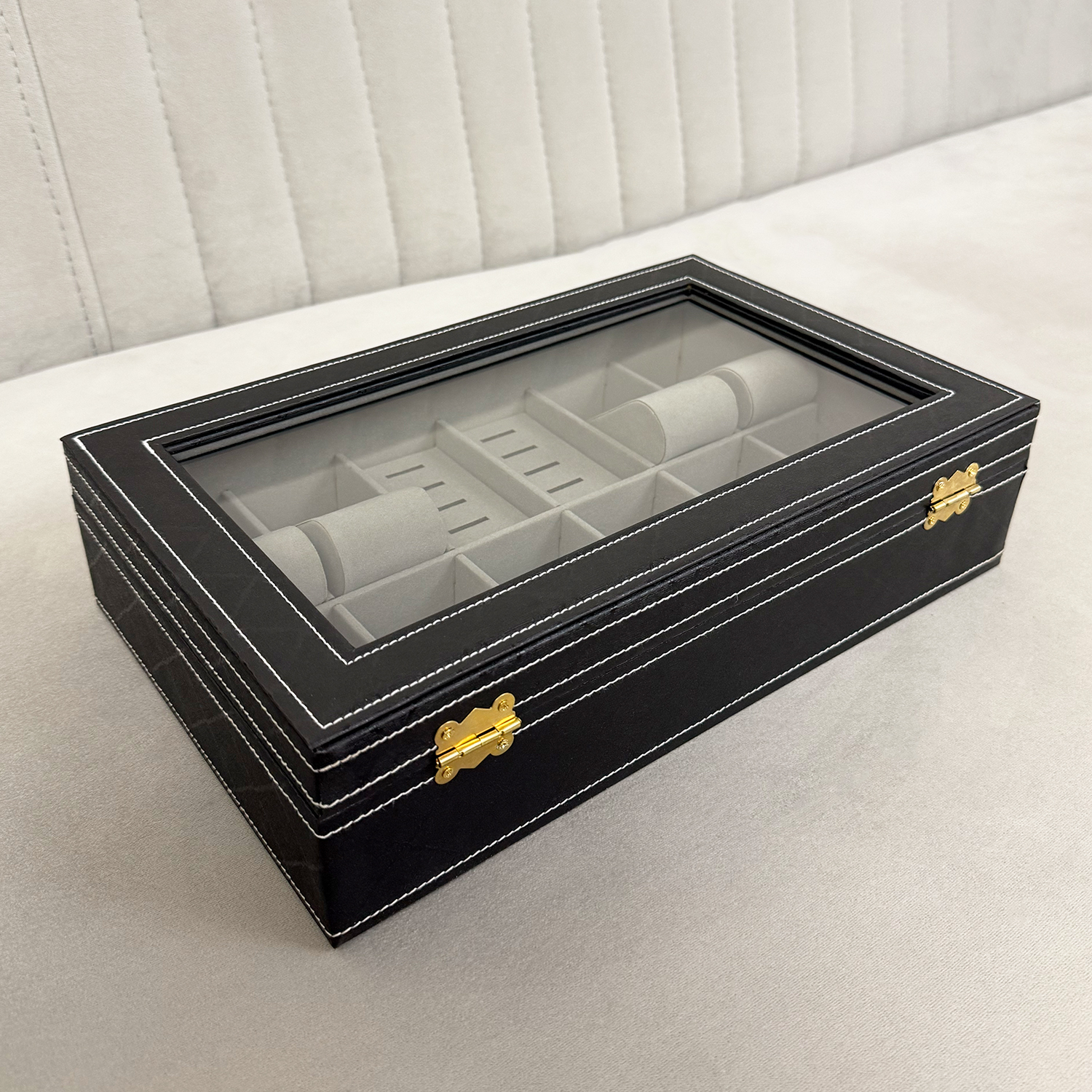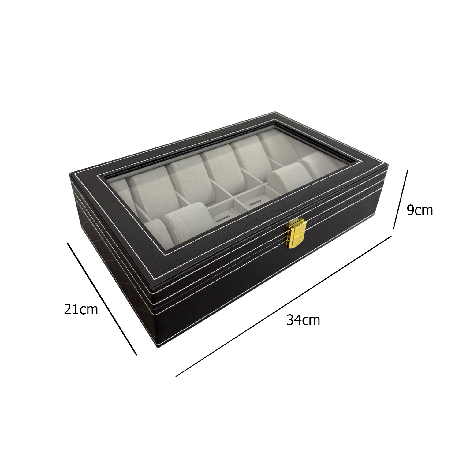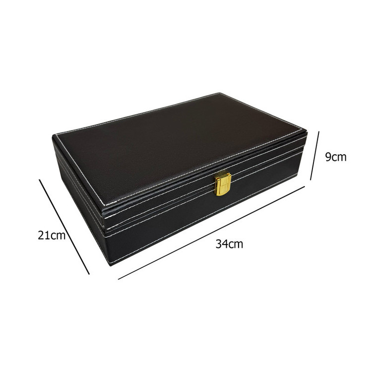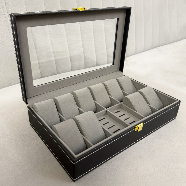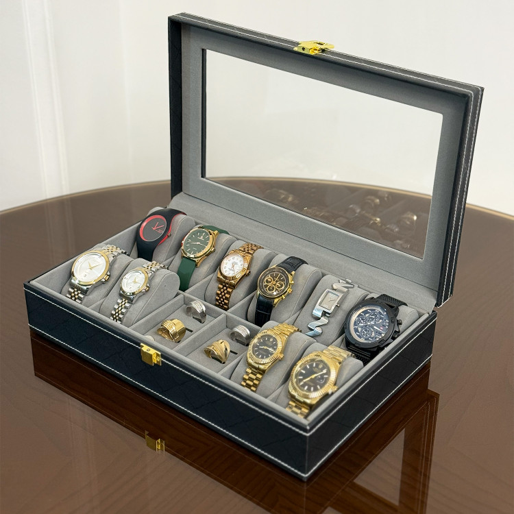 ظرفیت جعبه درب شیشه ای: ۱۰ عدد ساعت، ۸ عدد انگشتر