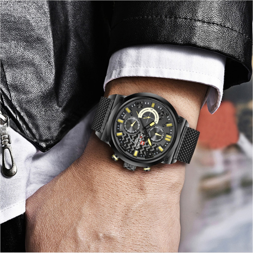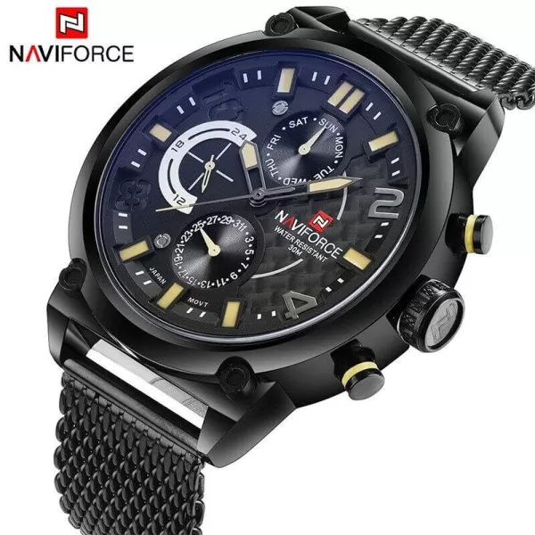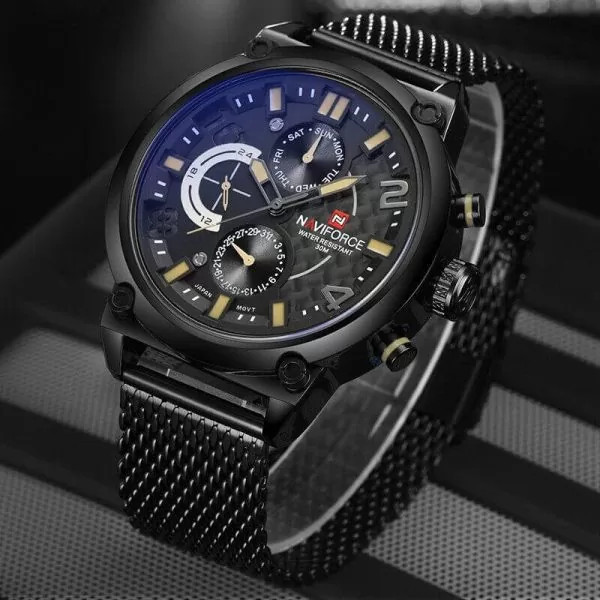 ساعت مچی مردانه Naviforce NF9068 یکی از مدلهای فول تایم و حرفهای این برند محبوب است که تمام موتورها و نشانگرها فعال هستند بند حصیری استیل، طراحی شیک و مدرن ارائه میدهد. این ساعت آنالوگ با موتور کوارتز دقیق ساخت ژاپن، گزینهای عالی برای آقایان خوشسلیقه در استفاده روزمره و نیمهرسمی به شمار میرود.