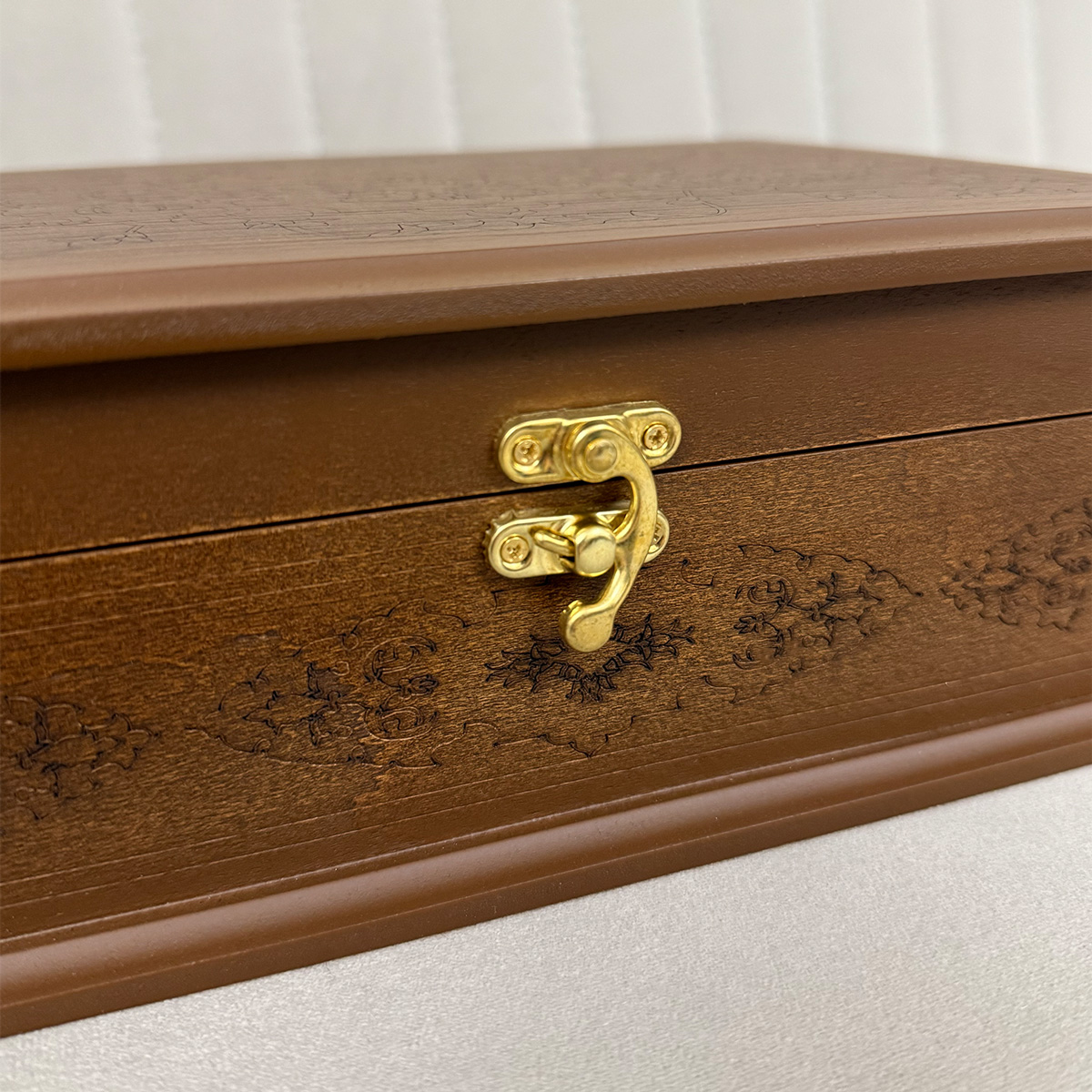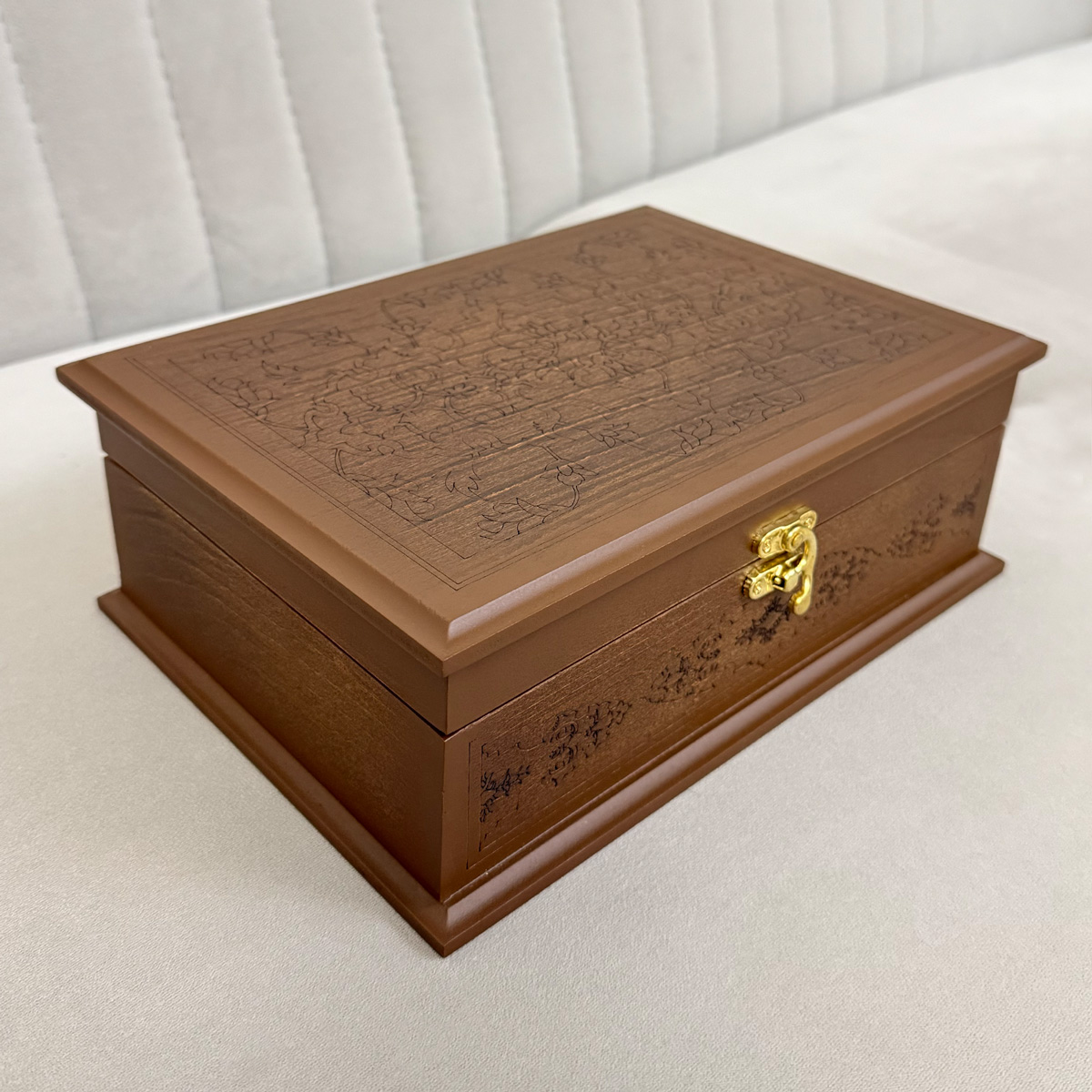 روی درب جعبه، نقشونگار ظریف حکاکی شده که حس سنتی و اصالت را به محصول القا میکند، در حالیکه پنجره شیشهای زیر آن امکان مشاهده محتویات داخل را بدون باز کردن درب فراهم میسازد. این ترکیب ظاهری، جعبه S101 را به گزینهای شیک برای سرو در مهمانیها، روی میز پذیرایی یا حتی هدیه دادن تبدیل کرده است.